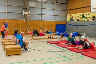Wir trainieren mit modernen effektiven Fitnessgeräten wie: Brasils, Theraband und Loop, Hanteln, alle Klein- und Großgeräte in der Turnhalle