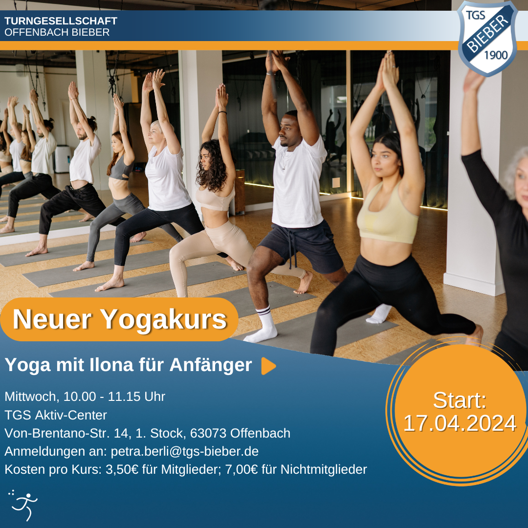 Nach den Osterferien bietet die TGS Bieber einen weiteren Yogakurs am Vormittag an, der sich vor allem an Anfänger und Neueinsteiger richtet. Wer fit in den Tag starten oder beispielsweise eine bewegte Pause im Homeoffice einlegen möchte, ist hier genau richtig. Der Kurs findet ab dem 17.04.24 immer mittwochs von 10.00 - 11.15 Uhr im neuen Aktiv-Center der TGS Bieber statt (Adresse: Von-Brentano-Straße 14 - 1. Stock, 63073 Offenbach). Pro Kurs belaufen sich die Kosten für Mitglieder auf 3,50 Euro und für Nichtmitglieder auf 7,00 Euro. Aufgrund von begrenzten Raumkapazitäten wird um vorige Anmeldung per Mail an petra.berli@tgs-bieber.de gebeten. Unsere Trainerin Ilona freut sich auf alle Interessierten!