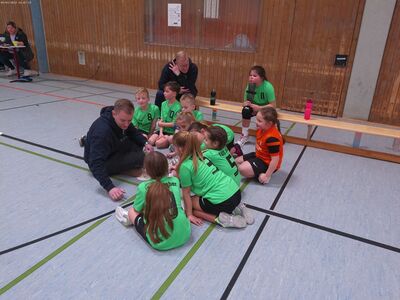 Nach der Aufwärmphase und einigen taktischen Infos unseres Trainerteams ging es dann auch los. Das erste Spiel des Tages bestritten wir gegen den Gastgeber. Aufgrund der Mannschaftsstärke des Gegners wurde in 4vs.4 gespielt. Die Tore kamen einen etwas klein vor, auch das Spielgerät war eher ein Gummiball. Wir starteten mit Lara (TW), Marie, Ana, Iva und Tea. Auf der Ersatzbank nahmen zunächst Tristan, Felix, Mira, Philipp und Nicole platz. Wie schon einige Male zuvor, taten wir uns etwas schwer ins Spiel zu kommen. Lara war zum Glück gleich hellwach und konnte den ersten Versuch der Gastgeber parieren. Nach und nach setzte sich unsere Mannschaft durch und kam durch einige schöne Tore zu einen relativ beruhigenden 4-Tore Vorsprung zur Halbzeit.