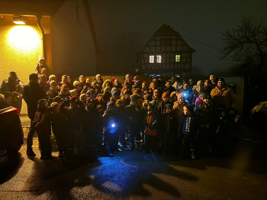 Nach einigen Worten ging es endlich hinaus in den dunklen Wald. Vorneweg Sascha, Trainer der F2, Minis & Bambinis, und dahinter über 30 Kids mit ihren Familien. Nachdem wir einige Minuten durch Wald und Wiese gegangen sind, versammelten wir uns für ein Gruppenfoto vor der Gaststätte Obermühle. Nach dem kurzen Fotostop ging es weiter, wieder in den Wald in Richtung Waldeck wo es ja die Überraschungen geben soll.