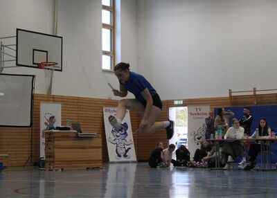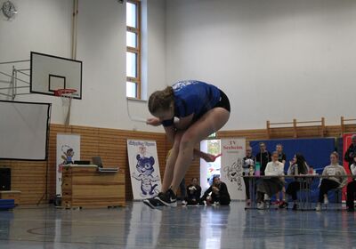Der Wettkampftag begann bereits sehr früh um 8 Uhr mit der Hallenöffnung. Leider konnten nicht alle Zuschauer einen freien Tribünenplatz ergattern, da bei einem sehr großen Teilnehmerfeld von 150 Springerinnen und Springern entsprechend viele Betreuer, Eltern und Freunde mitgereist sind. Der Wettkampf begann wie immer mit dem Einlauf der Vereine und einer Ansprache durch unsere Vereinsvorsitzende Eva Fuchs, die begrüßende Worte an alle Anwesenden richtete.