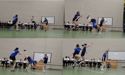 Auch in diesem Jahr wurden am Morgen erst die Meisterschaften eines anderen Turnverbands ausgetragen, sodass der Wettkampf erst gegen 12 Uhr startete. Wie immer ging es mit den vier verschiedenen Speed Disziplinen los. Hierbei zeigten Julia und Finja im Single Rope Double Under Relay eine super Leistung mit 150 Zählern in 60 Sekunden. Ailina, Anna-Lena und Jessica freuen sich beim Double Dutch Speed Sprint über einen neuen Rekord mit 145 Zählern, ebenfalls in 60 Sekunden.